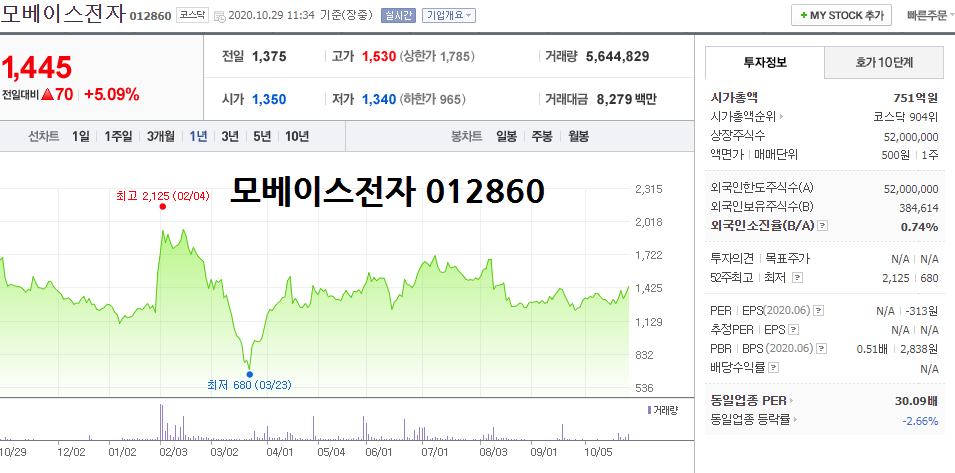 △모베이스 101330, 모베이스전자의 최대주주로 같은 윤석열 테마 흐름을 보여주는 종목.