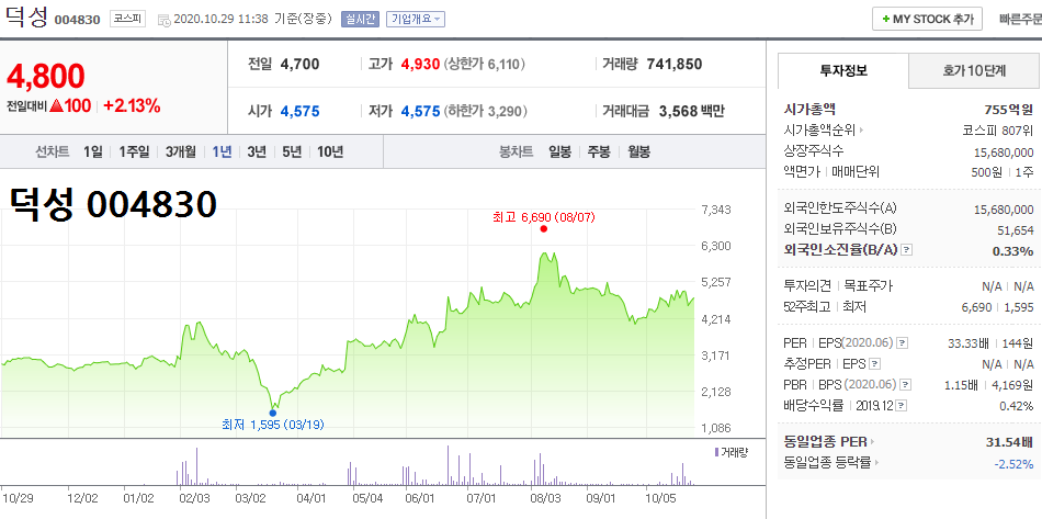 덕성의 대표이사가 윤총장과 같은 서울대 법대 출신으로 윤석열 관련주 움직임 부각.