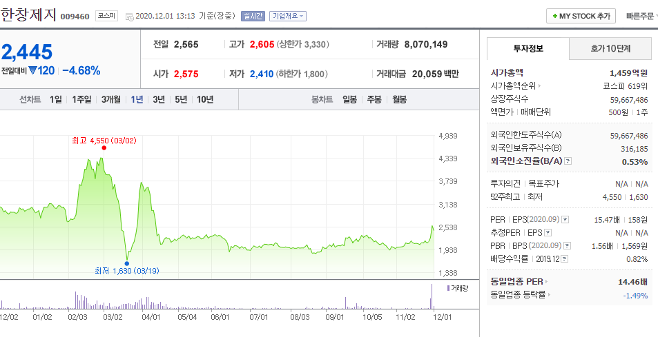 한창제지는 마닐라 판지 및 백판지의 제조, 도매를 주요 사업으로 하고 있으며 판지 제조업의 매출액이 총매출액의 90% 이상을 차지, 골판지 관련주 움직임 부각