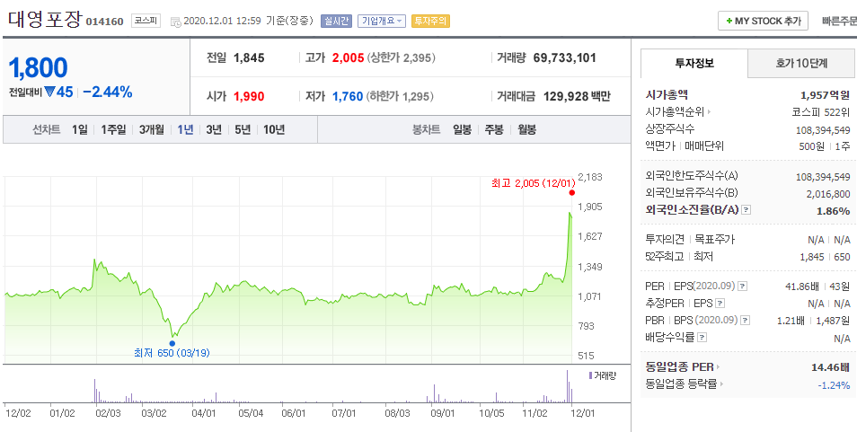 골판지 전문 제조업체인 대영포장은 최근 상한가로 거래를 마치며, 태림포장 주가는 전 거래일에 비해 25%나 급등. 골판지 관련 종목들의 상승세는 최근 '코로나 19 3차 대유행'의 기세가 좀처럼 잡히지 않고 400명 이상의 확진자 수가 계속 나오는 이유로 보고 있다.