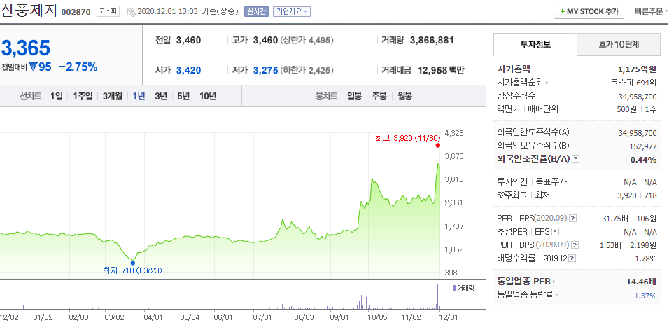 신풍제지는 백판지(포장용 상자로 사용) 전문 제조업체로 지류유통판매업을 영위, 골판지·포장 관련주 움직임 부각