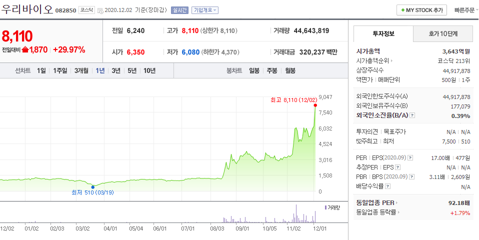 바른손과 바른손이앤에이는 바이오엔텍의 주식 1만 800주를 보유하고 있기 때문에 거의 유일하게 바이오엔테크와 관련 있는 관련주로 대장주 움직임 부각