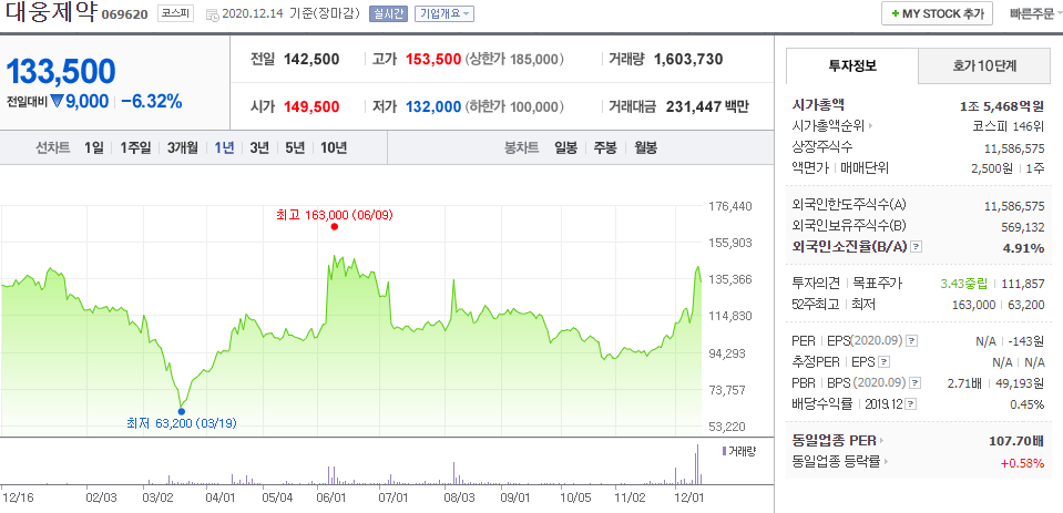 코로나 19 치료제 개발을 위한 경쟁이 가속화된 가운데 대웅제약이 임상 시험 진행 중인 호이스타정(카모스타트 메실산염)에 대한 투자자들의 관심이 높아지는 가운데 10%대 급등