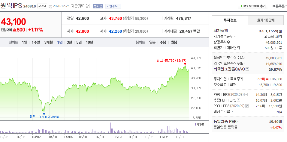 원익 홀딩스에서 인적 분할된 국내 2위 반도체 장비 생산업체로, 삼성전자가 지분 3.8%를 보유하고 있다. 반도체 박막 형성을 위한 증착장비가 주력사업이며, 미국의 램리서치를 대체해 삼성전자에 몰딩 장비를 재공급하기 시작하며 기술력을 인정받음.