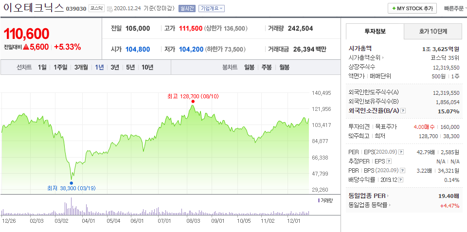 △이오테크닉스 039030 : 삼성전자와 8년간 공동 연구개발(R&D) 개발 끝에 수입에 의존하던 고성능 레이저를 국산화하는데 성공