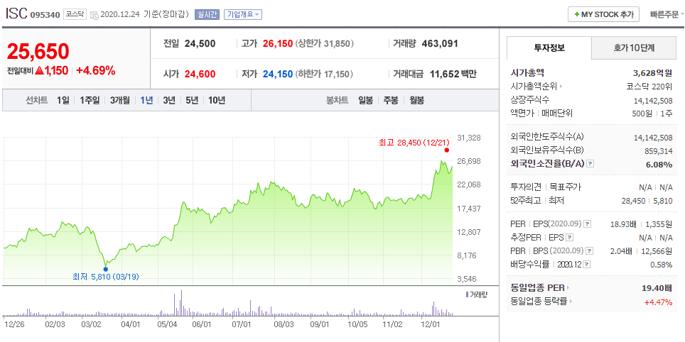 ISC는 반도체 및 전자부품 검사장비의 핵심 부품인 후공정 테스트 소켓 제품 생산 등을 목적으로 설립되었으며 메모리, 비메모리 반도체 테스트 소켓 제품을 공급 중인 회사.
