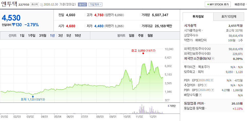엔투텍은 반도체 및 디스플레이 공정 장비의 진공 Camber와 특수 진공밸브 제조업을 주요 사업으로 영위하는 회사. 주요 사업부문으로는 반도체 장비 부품 사업부문과 엔터테인먼트, LED 응원봉 및 MD상품 사업, 마스크 제조 사업부문 등