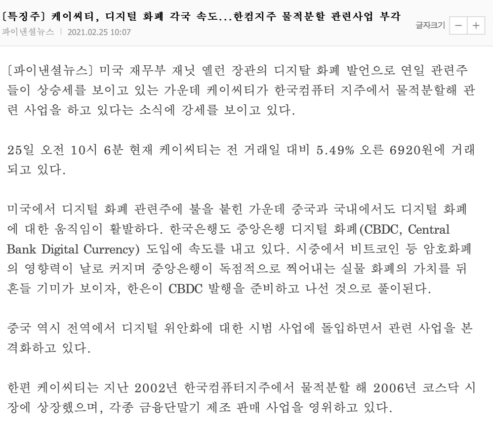 <<< 미국, 중국, 국내에서 디지털 화폐가 주목받으며 각종 금융 단말기 제조 판매 사업을 영위하는 이유로 기대감에 상한가 기록 >>>