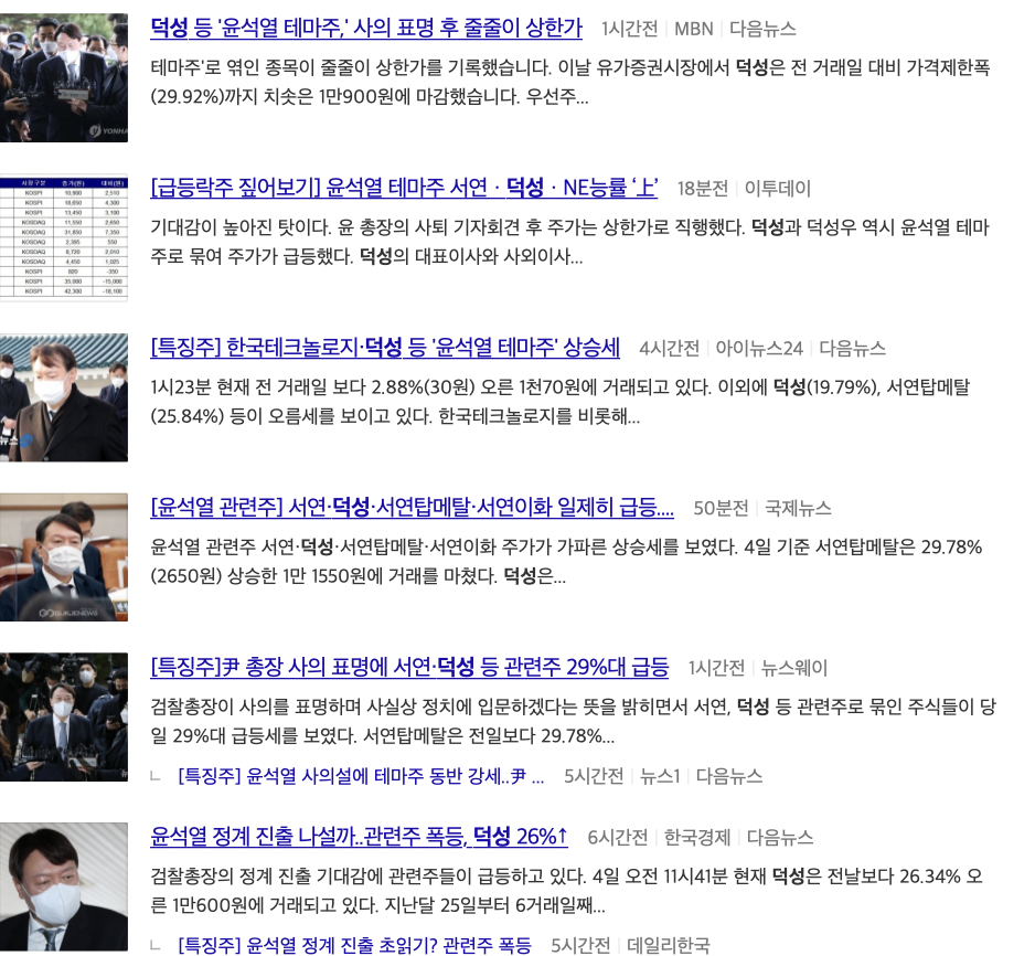 덕성은 '이봉근 대표이사와 김원일 사외이사가' 윤석열과 서울대 법대 동문이라는 이유로 대표적인 한국 정치인 지인 테마주로 윤석열 관련주 중 대장주로 움직임