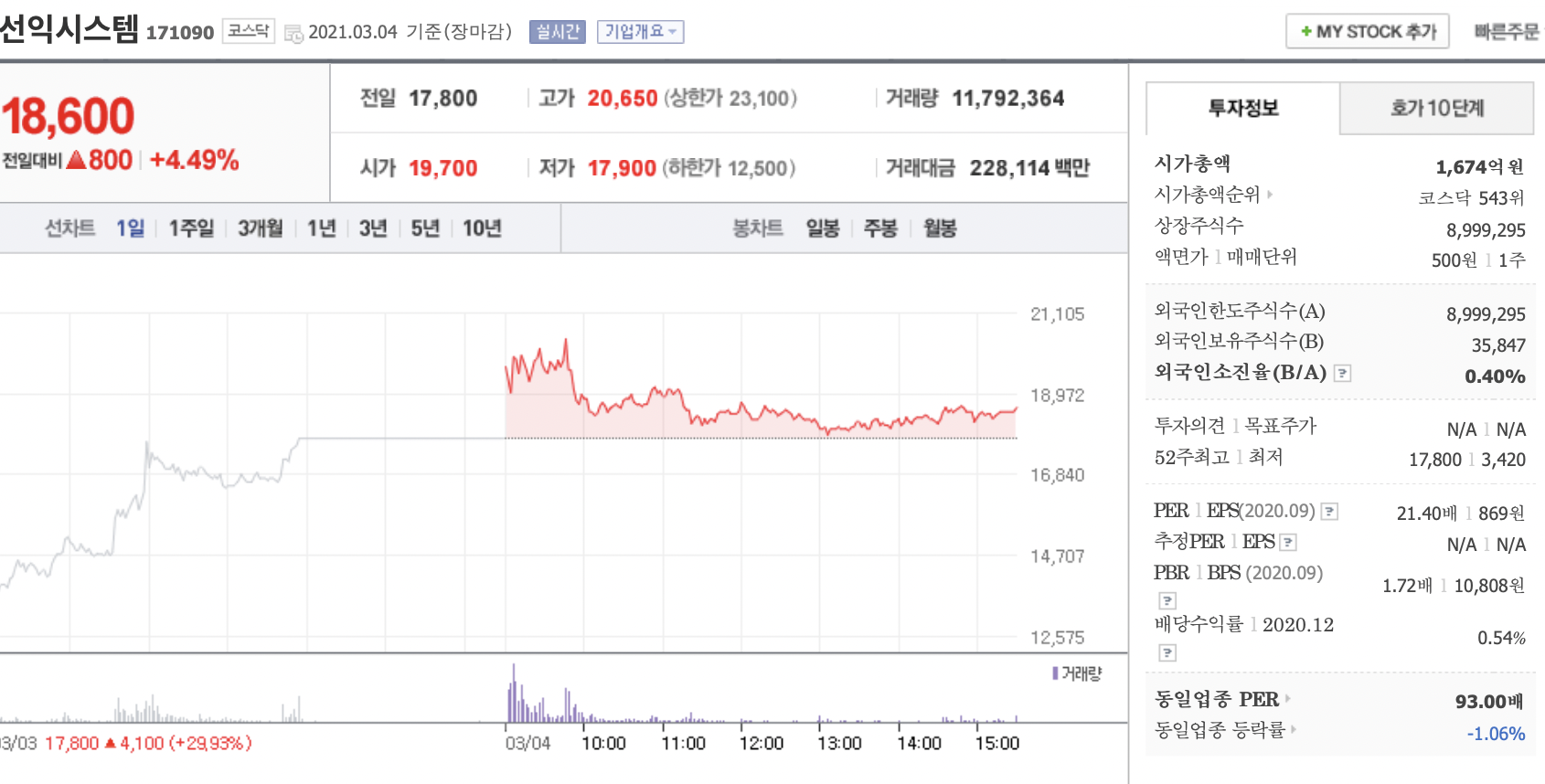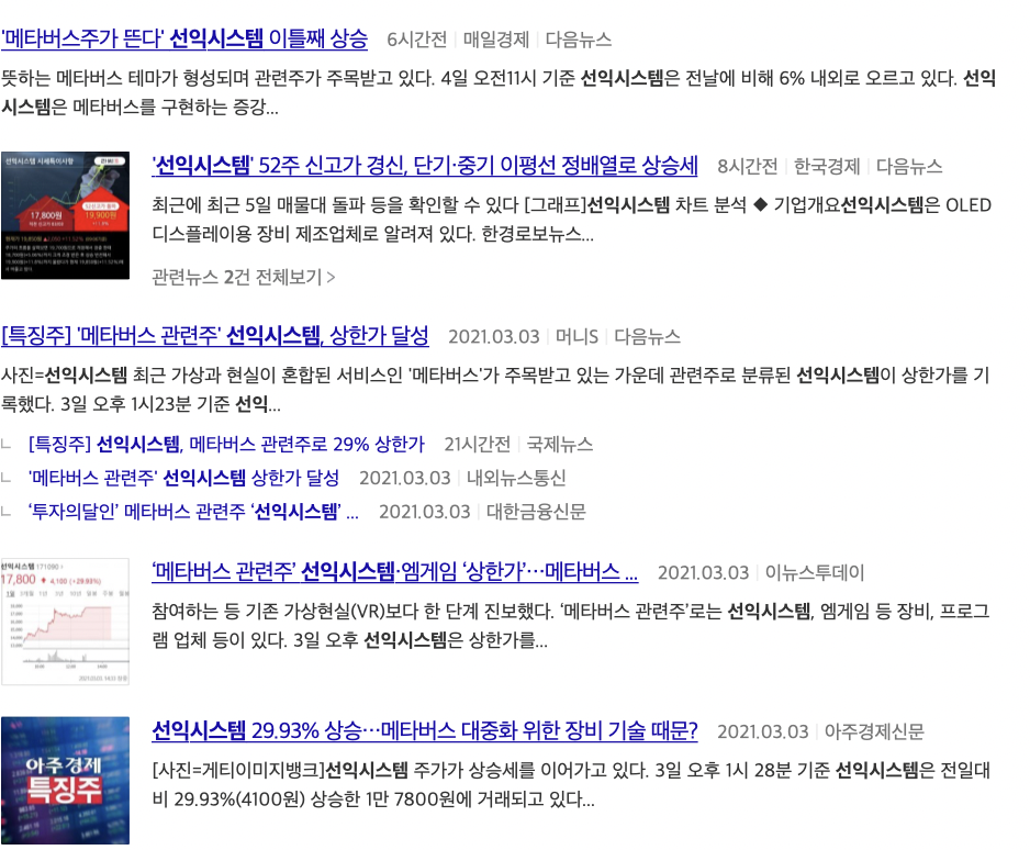 선익시스템은 OLED 제조장비를 생산하는 기업으로서 AR과 VR기기 생산에 들어가는 증착 장비 공급기술을 가지고 있어 향후 비전이 강한 메타버스, AR, VR 테마 관련주로서 대장주의 움직임을 보임 >> 3월 3일 오늘의 상한가 기록