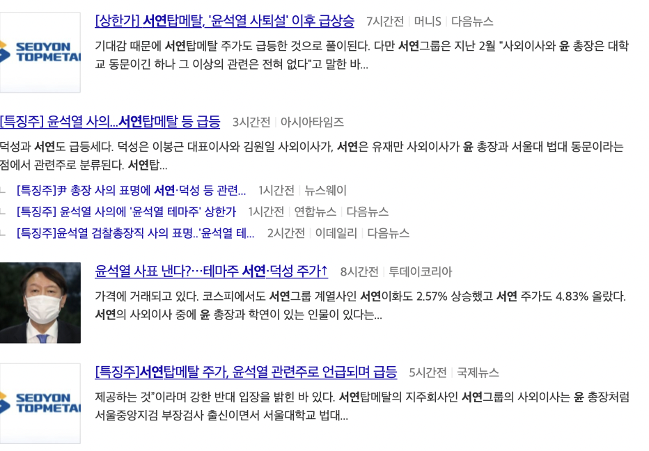 서연은 '유재만 사외이사'가 윤석열과 서울대 법대 동문, 같은 서울 중앙지검 부장검사 출신이라는 이유로 대표적인 한국 정치인 지인 테마 관련주로서 대장주의 움직임을 보여줌.