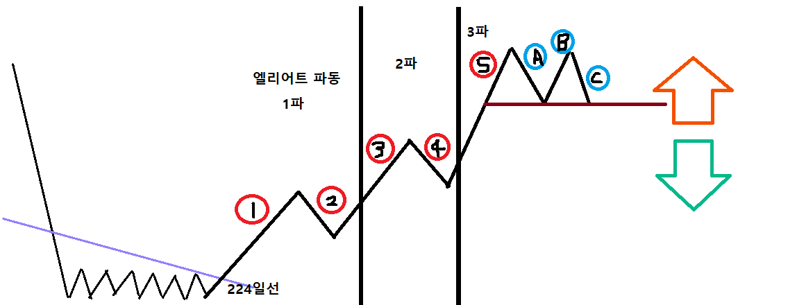 밥그릇 패턴이 형성된 후, 224일선을 뚫어 올리는 파동을 1파 > 2파 > 3파 > 4파 > 5파 > A파 > B파 > C파 형태로 주가는 움직인다.